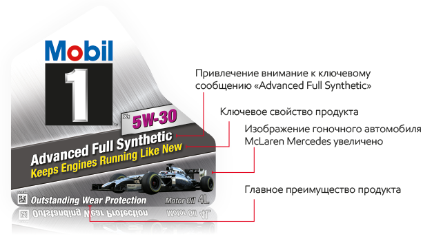 Задача – сохранить статус Mobil 1 как ведущего бренда на мировом рынке синтетических смазочных материалов, увеличить объем розничных продаж и усилить лояльность потребителей к бренду. Для этого обновляются фронтальные этикетки всех шести продуктов Mobil 1, предназначенных для розничной продажи.